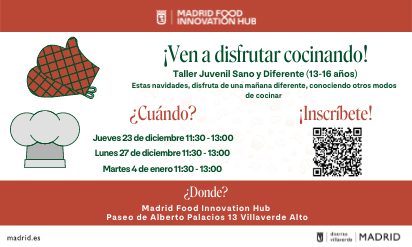Desde Madrid Food Innovation Hub, el primer centro de emprendimiento en alimentación perteneciente al Ayuntamiento de Madrid. Somos una iniciativa pionera enfocada a fomentar la innovación y el emprendimiento a lo largo de toda la cadena de valor agroalimentaria. Desde Villaverde para el mundo.Estas navidades arrancamos nuestro talleres "Sano y diferente" con el fin de que los niños y niñas (6 a 12 años) y jóvenes (12 a 16 años) de nuestras casas conozcan otras maneras de cocinar.¡Será una experiencia diferente, educativa y divertida en la cocina!¿Qué aprenderán?Conocer las propiedades de los alimentos.Aprender nuevas formas y técnicas de cocinar saludables.Cocinar con medidas caseras.Economizar en la cocina, aprovechando todos los recursos de los que disponemos sin desperdiciar nada.Combinar en un mismo plato distintos ingredientes para conseguir el equilibrio nutricional.Improvisar con los recursos que se dispongan cuando falte algún utensilio.Improvisar a la hora de tener que prepararnos la comida con poco tiempo.Cuidar la presentación de los platos, aprendiendo formas curiosas y originales.Valorar el acto de comer, dándole la importancia que merece como momento social.¿En qué días y horarios se impartirán?Jueves 23 de diciembre:10:00 - 11:30 - 6-12 años11:30 - 13:00 - 13-16 añosLunes 27 de diciembre:10:00 - 11:30 - 6-12 años11:30 - 13:00 - 13-16 añosMartes 4 de enero:10:00 - 11:30 - 6-12 años11:30 - 13:00 - 13-16 añosCada taller tiene capacidad para 12 participantes.¿Cómo apuntarse?Los padres y madres pueden apuntar a sus hijos e hijas pinchando en los siguientes enlaces.Taller infantil (6-12 años): https://bit.ly/tInfantilTaller juvenil (13-16 años): https://bit.ly/tjuvenil